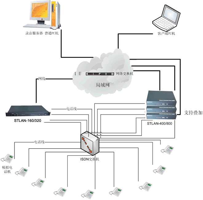 錄音存儲(chǔ)服務(wù)器與STLAN硬件通過標(biāo)準(zhǔn)TCP/IP協(xié)議網(wǎng)絡(luò)相連,因此不受限于服務(wù)器存放位置,錄音設(shè)備可以放在任何有網(wǎng)絡(luò)接口的地方。