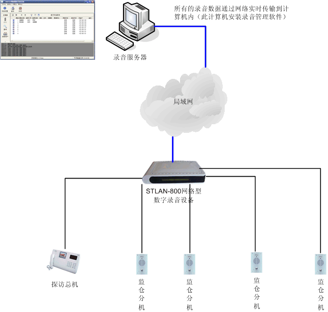 如果探訪對(duì)講和監(jiān)倉對(duì)講設(shè)備有摘機(jī)和掛機(jī)功能,我們通過標(biāo)準(zhǔn)的壓控方式對(duì)它們進(jìn)行錄音,錄音的方式與對(duì)電話線路錄音一眼。如果沒有摘機(jī)和掛機(jī)功能,我們可以以聲控的方式錄音,采用并線的方式獲取音頻信號(hào)送給STLAN錄音設(shè)備。錄音設(shè)備將模擬信號(hào)音轉(zhuǎn)成數(shù)字信號(hào),實(shí)時(shí)通過網(wǎng)絡(luò)傳至錄音服務(wù)器,進(jìn)行永久保存,可以隨時(shí)查詢調(diào)用。通過服務(wù)器端軟件,可以實(shí)現(xiàn)實(shí)時(shí)監(jiān)聽。局域網(wǎng)中的任意計(jì)算機(jī)都可以通過web瀏覽器查詢數(shù)據(jù),客戶端不需要安裝任何軟件。