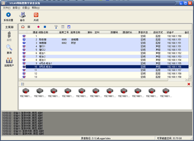 每臺(tái)設(shè)備,每個(gè)通道都可以獨(dú)立設(shè)置和管理,錄音文件按通道、日期、時(shí)間等項(xiàng)目分類保存,便于根據(jù)任意條件或者組合條件進(jìn)行快速查詢,快速播放。還可以將重要的文件備份出來(lái)。文件格式為標(biāo)準(zhǔn)的WAV,兼容市場(chǎng)上絕大多數(shù)的播放軟件。
